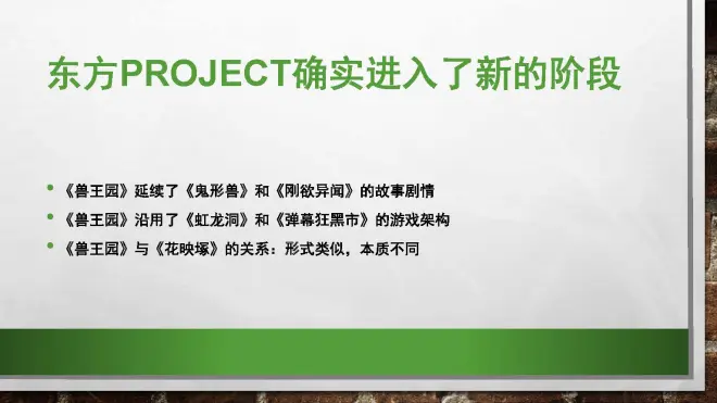 我们回顾一下《花映塚》。《花映塚》是2005年8月发布的。2005年12月发布了一个游戏叫《文花帖》,2006年一整年没有游戏,开启了《三月精S》的连载,写了《求闻史纪》。今天,我们站在现在的角度讲,《兽王园》也是一部至少总结了前三部游戏的作品,ZUN如何规划下一步的动作?