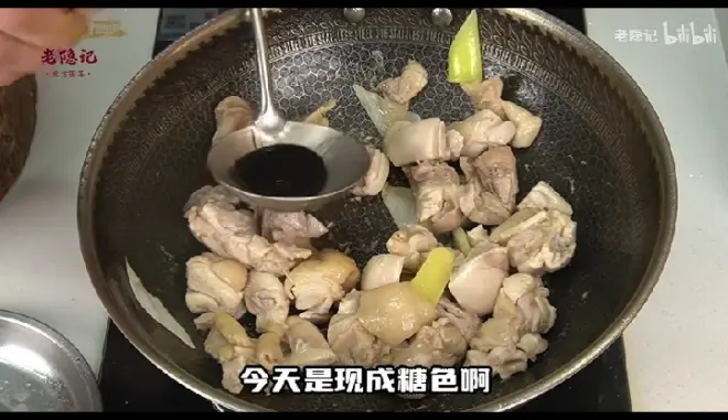 炒2分钟出香后加热水,水量基本与鸡肉持平,加一勺半的白糖(约4.5g)提鲜、少许松鲜鲜、胡椒粉,转慢火让鸡肉慢慢成熟收汁。