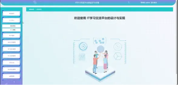 用户登录后,用户能够看到IT学习交流平台的导航条包含首页、学习资料、学习视频、交流论坛、知识测试、系统公告、后台管理、个人中心等,界面如图5-3所示: