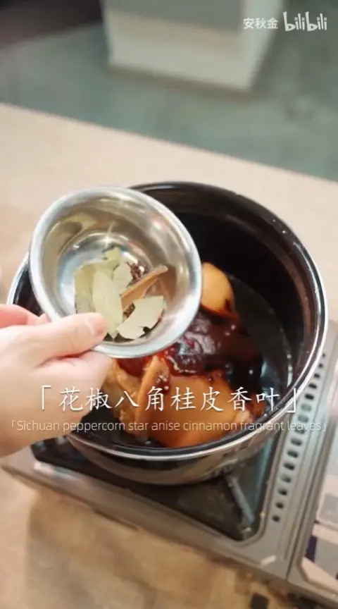 肘子回炖锅,汤汁过箩倒入,加盐、鸡粉、熟鹌鹑蛋盖盖最小火炖半小时