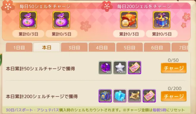 在有效期间,您可以根据通过充电获得的“付费炮弹”数量获得奖励物品。 奖励有两种类型:满足“1 个付费贝壳”和“×× 50 个付费贝壳”的条件可以获得的每日奖励,以及根据达到条件的天数可以获得的累积奖励。 在这种连续收费中,“宾果门票你也可以得到它!