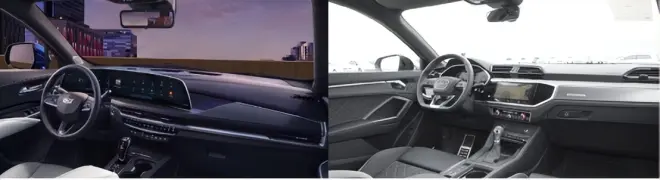 内饰部分,凯迪拉克全新XT4其横贯中控台的33英寸环幕式超视网膜屏,是同级别产品中长度最长,清晰度最高,显示效果最好的屏幕,分辨率高达9K,还支持10亿种色彩显示,像素密度高达271PPI,画质效果非常出色,并且整体的搭配更加凸显科技属性。此外,内置的AI智能语音助手可以提供自然、无障碍的人机交互。全新XT4还支持整车OTA升级。反观奥迪Q3,10.1英寸的中控屏对比凯迪拉克全新XT4的33英寸环幕屏就差点意思了,分辨率一般,画质普通。同时奥迪Q3不支持OTA升级,因而无论是科技性还是智能性,奥迪Q3都无法与全新XT4相比。