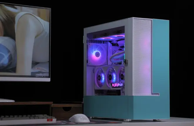 奔着白色纯欲主题,机箱方面选择的是影驰Touch(触觉)蒂芙尼蓝色版机箱。蓝色皮革与金属的碰撞,给白色的机箱也带来了些许俏皮的小清新。除了出众的颜值,机箱安装兼容性也非常优秀。兼容全规格主板,显卡限长390mm,支持顶置/前置360水冷。此外,机箱PCIE槽位还支持显卡横装/竖装两种模式的快速切换,对于喜欢竖装的玩家非常友好;