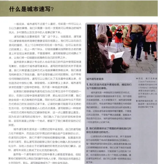 本书主要说明了如何使用各种绘画媒材与技巧来进行快速而有效的速写,也对透视、构图、色调、质感、暗部与投影等一些素描基础要素作了简要的介绍,书中并不过分强调技巧,或重视某一技巧而看轻另一技巧,而是注重通过简单而直接的勾勒和色调、阴影与色彩的作用来增强速写的画面效果。