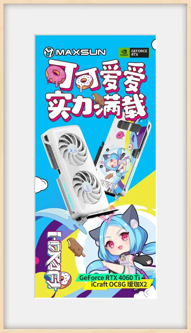 据介绍,这是铭瑄瑷珈系列的首款双风扇产品 GeForce RTX 4060 Ti iCraft OC8G 瑷珈 X2,在体积大幅缩小搭配 Q 版形象后,双风扇瑷珈的整体设计显得更加 Q 萌,正面采用简约白色涂装,而背板设计则是鲜艳多彩的糖果配色。