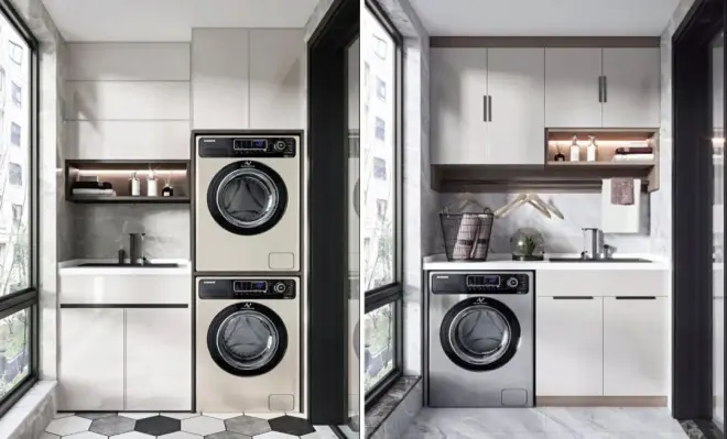 如果一边是洗衣机、烘干机叠加竖放,另一边是洗手台的结构,洗衣机和洗手台预留的宽度、深度与上者一样