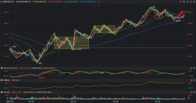 纸浆今日收锤子阳线,日线一笔下对待,等待下方分型的确认,操作上等待日线一笔反弹不进入中枢后的3卖介入会更好,内部结构上,30分钟一笔反弹是3卖,配合MACD指标,个人偏向构建中枢对待,夜盘先关注下方的分型是否能确认。再看5分钟图,30分钟这一笔下目前是盘整背驰,之后的一笔反弹力度也不弱,夜盘关注当前区域是否构建破位结构;