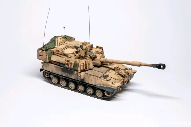 继续手涂分色。铝箔贴纸又用在了各种观察窗位置。炮口位置涂了点黑,因为M109的炮口永远埋埋汰汰的,算是预置黑色。随后用生褐轻度渍洗了一下全车。