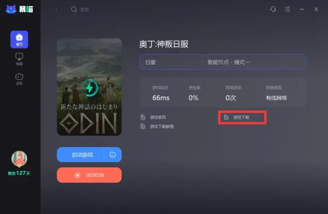 第一步,打开暴喵加速器并搜索“奥丁神叛日服”。在搜索结果中找到游戏并加速下载。加速完成后,点击加速器界面的“游戏下载”按钮,进行游戏下载器下载。
