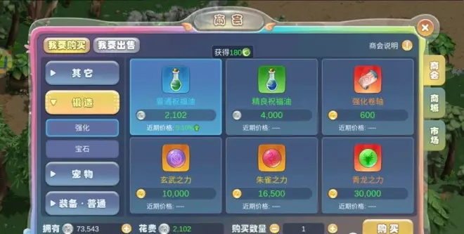 强化装备相信大家应该都不会陌生,强化成功后提升战力评分,如果强化失败,强化道具消息,装备无损失,强化道具是祝福油,强化等级越高祝福油用的就越多,获取途径其一是神秘岛,完成神秘岛可获取大量的祝福油,其二就是商会,商会购买用的是银币,银币还是比较好获取,击败野怪,创魔界,内政任务,梦玉兑换等等都是可以获取大量银币的。