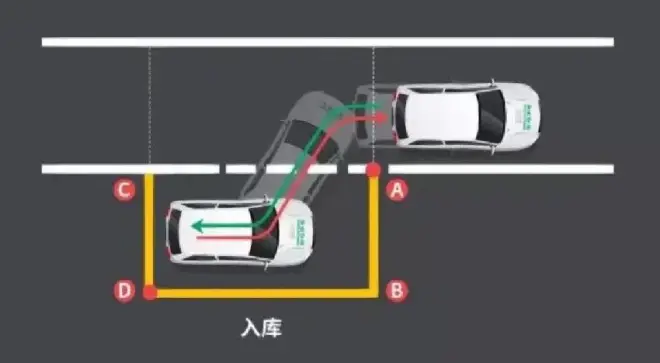 2、左后视镜与直角平行方向盘向左打满,中途不可停车压线,后轮过线后回正方向盘(坐姿不同,点位稍作调整)
