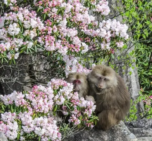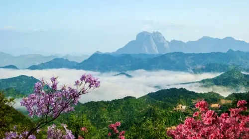 5月的明堂山,是野生杜鹃的王国。崖壁上绽放的高山杜鹃与青山绿水相伴,让人如入画境。山中的云雾或淡如轻烟,或浓似纱帐,映衬得杜鹃花格外动人。