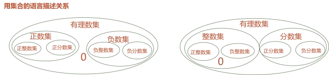 整数和分数统称为有理数(rational number)。按照上边的定义,我们就有了下边的两个关系图: