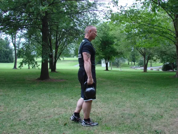 人们需要整体力量、上肢力量、核心力量和控制力。因此,我们会进行很多结合壶铃的整体训练。我们通过进行六个基本的RKC训练动作,确保每个人都能进行全身训练。我可能会稍微偏重于肩膀,因为当人们遇到一个6或8英尺高的墙时,他们需要肩膀的力量来攀爬。对于这一点,我最喜欢的动作是行走式的交替推举和行走式的摆荡。