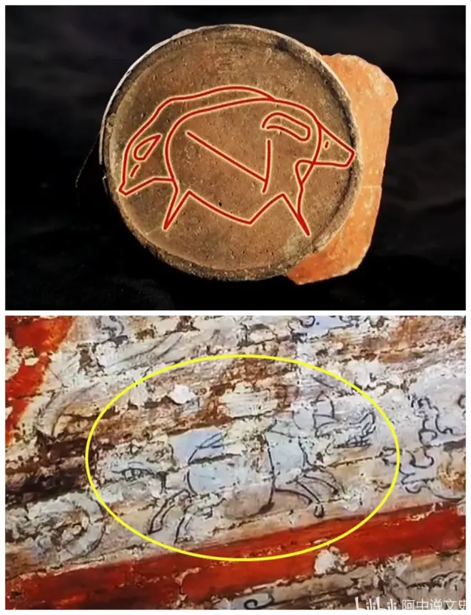 还有一个碗底,刻画的是一左一右的双头猪图形,比双墩晚了2000多年的红山遗址,也出土了不少双头猪造型的玉器,比双墩晚了5000年的汉墓天象壁画中,双头猪图像同样频频出现,其所在方位正好对应了北斗七星,这是否意味着,7000年前双墩人在碗地刻下的双头猪,代表的就是天上的北斗?