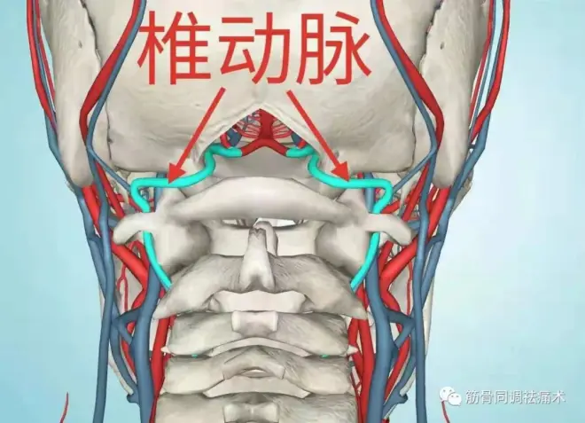 大家通过下方图片可以看到,“椎动脉”是从颈椎横突当中的“横突孔”中间穿过来的,并且在第一颈椎上面,呈90度拐弯后上行,经过枕骨大孔进入颅内,形成“椎基底动脉”,两侧的椎动脉上行汇合而成的“椎基底动脉”,需要提供我们头部3分之一左右的血液。