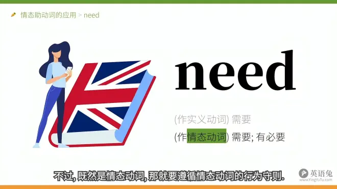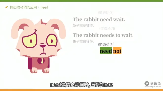 上图前一句话语补充:但是请注意,这里的needs可就不是情态动词了,而是变了位的谓语动词,