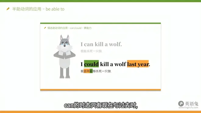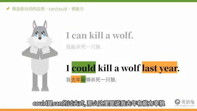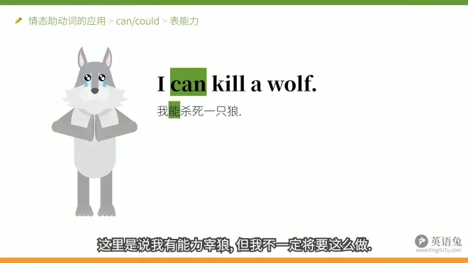 上图前一句补充:can 在这里表示一种能力,不是说兔子真的杀过或者会杀一只狼。不用can这个词,就没办法表达这个意思,