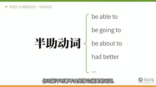 半助动词也有情态含义,但也像主动词,有很多。Be able to, be going to, be about to, had better.