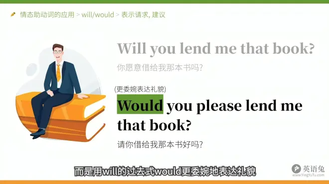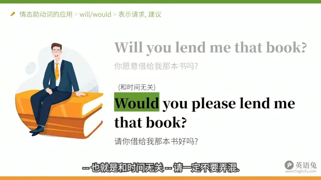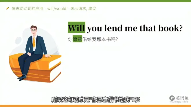上图前一句话语补充:这里的will虽然理论上有可能构成将来时,表示“你将要借我那本书吗?”但更大的可能性表请求,询问对方是否“愿意”做某事,