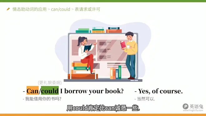 上图前一句补充:问句中的can/could是在寻求许可,这里的could虽然是can的过去式变位,但是没有时间上的含义,而是更礼貌,更委婉。所以,在你请求他人做某事的时候,
