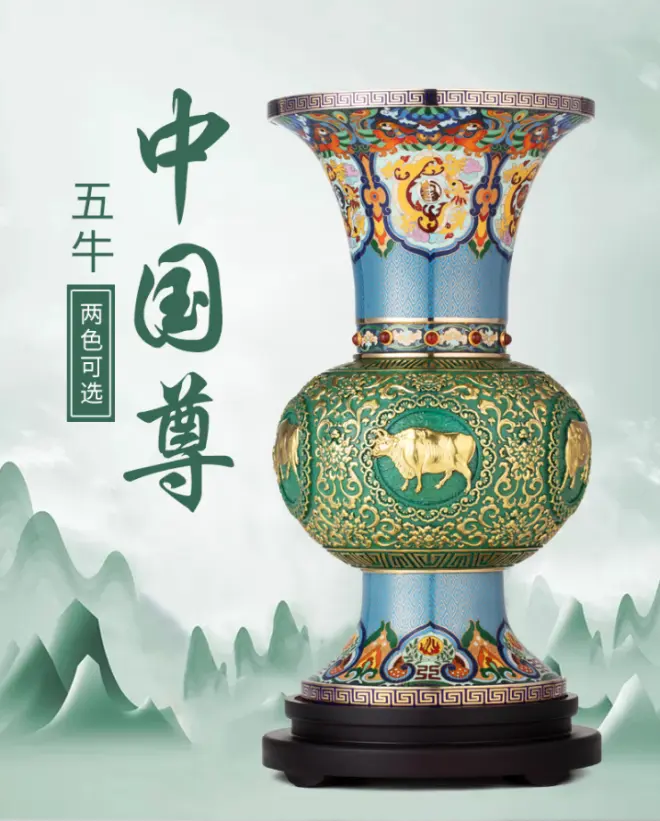 朱炳仁钟连盛《五牛中国尊》作品中间铜雕部分以故宫馆藏国宝、中国十大传世名画唐代韩滉《五牛图》为设计蓝本,以缠枝莲纹宝相花围绕映衬,采用繁难的高浮雕工艺,以朱炳仁独家高温琅彩技法,将五头金牛形神兼备立体呈现,再现了名画中的五牛风采。拓荒牛、好运牛、招财牛、旺家牛、如意牛,寓意五牛聚财、五福临门!