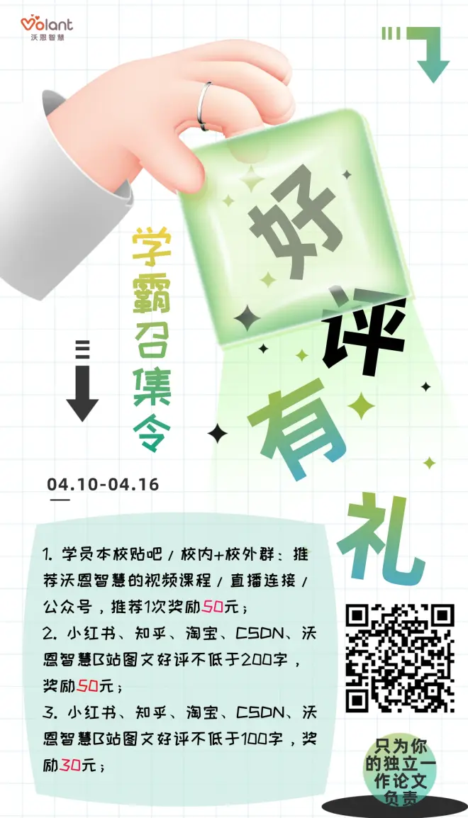 各位小伙伴,沃恩智慧推出了【学霸召集令·好评有礼】活动,只需要在我们的各个新媒体平台上为沃恩智慧课程写图文好评或者推荐视频课程/直播链接,就有机会赢取现金大奖和更多好礼!