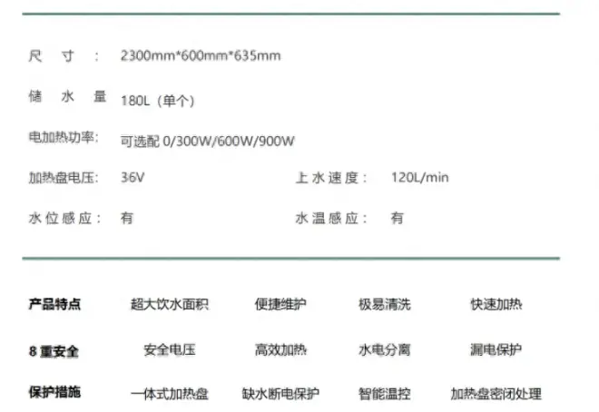 在极端情况下(水槽完全冻住后),解冻时不会形成空腔,避免加热盘干烧。电加热器均匀分布在水槽底部,加热更均匀,采用分体式设计,避免因一块电加热器故障影响其他单元工作。确保奶牛饮水温度不会产生太大波动。避免奶牛冬季饮水因为设备故障造成的负面影响。
