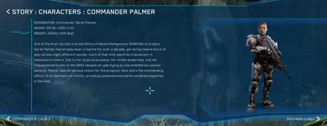Sarah E. Palmer(服务编号 65287-98303-SP)是一位斯巴达IV战士,也是人类星盟战争的老兵。战后,她从海军陆战队转调到新建立的独立斯巴达部队,并成为第一批斯巴达IV战士。目前,她是UNSC无尽号斯巴达部队的指挥官。