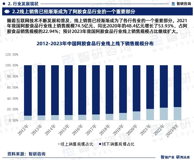 随着互联网技术不断发展和普及,线上销售已经渐渐成为了各行各业的一个重要部分。2021年我国阿胶食品行业线上销售规模74.5亿元,同比2020年的48.4亿元增长了53.93%,占阿胶食品销售规模的22.94%;预计2023年我国阿胶食品行业线上销售规模占比继续扩大。