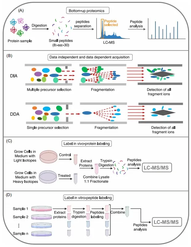 基因和转录的表达和调控水平可直接反应在成千上万的蛋白质的表达、PTMs和蛋白-蛋白间的相互作用水平上。液相色谱-质谱联用技术(Mass spectrometry coupled with liquid chromatography, LC-MS)是蛋白质研究中最常用的方法之一,且已成为肿瘤微生物组研究的有力工具。蛋白质组学研究有三种不同的策略:top‐down,middle‐down 和bottom‐up;其中top‐down(图4A)直接用MS对目标蛋白质进行检测,无需其他预处理;middle‐down首先将蛋白质酶解成大的肽段,然后用质谱进行检测;bottom‐up也称为鸟枪法,是使用最广的一种方法,蛋白质酶解成含有6-20个氨基酸的肽段(图4B)。
