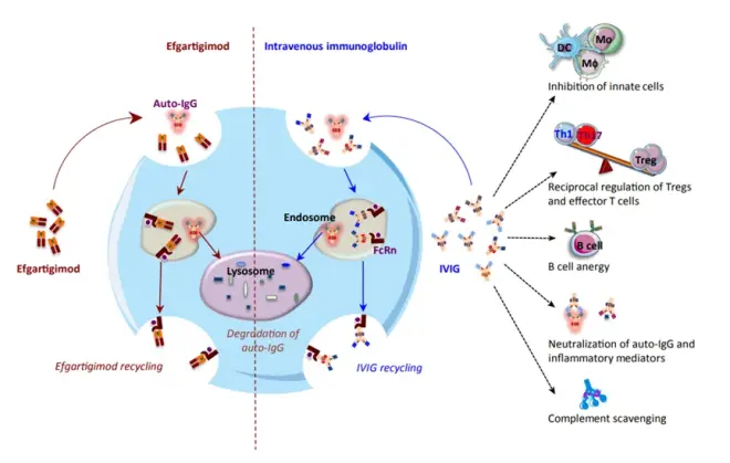 具体作用原理为:FcRn与血液的接触面积很大。当血管内皮细胞大量内吞血清中的蛋白时,FcRn可以有效地拦截IgG并将其返还到血液循环中,从而延长血清中IgG的半衰期。FcRn与IgG的结合是pH依赖性的:它们只在酸性条件(pH6.0-6.5)下结合,在中性(pH7.0-7.5)条件下解离。