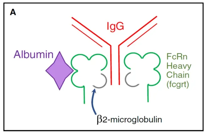 FcRn(neonatal Fc receptor,Brambell receptor,新生儿受体),是一种位于细胞膜表面的IgG抗体受体,其蛋白结构和MHC-I分子类似,包含由α链(α1、α2和α3)和β2微球蛋白组成的异二聚体,FcRn可以和IgG以及白蛋白结合,但是结合的位点不同,分别位于α链的内侧和外侧。