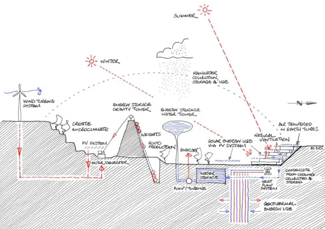 “日晷塔”既可以作为日晷所用,也可以作为能源塔使用。“日晷塔”高65米,下坠重物,坐落于混凝土斜墙坑中。在白天,能源花园的太阳能板所生产的能量可以将重物抬升至塔顶。在夜晚,被释放的重物下降至塔底,其产生的动能则成为了中心塔的额外动力。