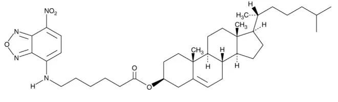 结构式:C[C@H](CCCC(C)C)[C@H]1CC[C@@H]2[C@@]1(CC[C@H]3[C@H]2CC=C4[C@@]3(CC[C@@H](C4)OC(=O)CCCCCNc5ccc(c6c5non6)[N+](=O)[O-])C)C