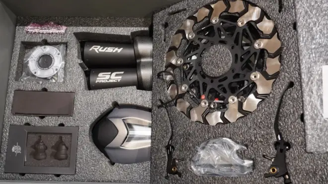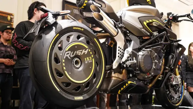 MV Agusta还为新款RUSH附赠了丰富的原厂改装件,有排气、前制动盘、射灯、牛角、后驼峰等。
