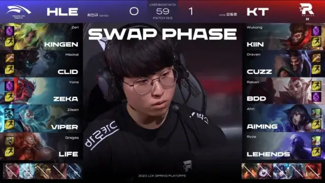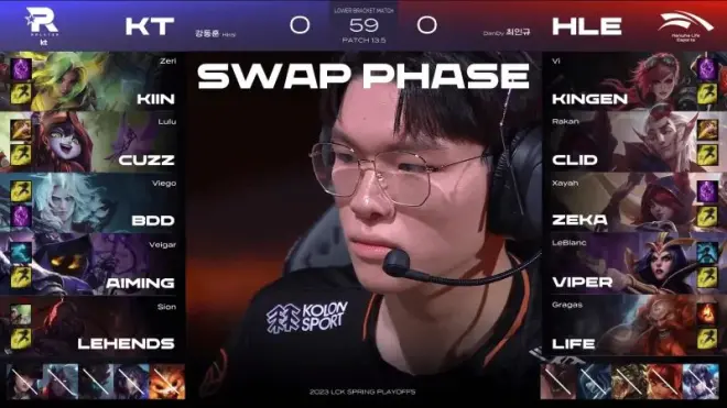 第一局比赛,KT蓝色方,禁用女警、韦鲁斯、大树、阿狸、纳尔,选用塞恩、佛耶戈、小法、泽丽、璐璐;HLE红色方,禁用瑟庄妮、安妮、鳄鱼、丽桑卓、石头人,选用酒桶、楚雨荨、妖姬、霞、洛
