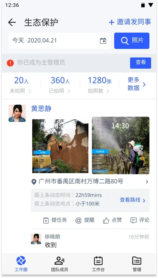 在团队管理上,通常无法对人员进行有效管理,无法实时对人员进行监督,因此工作效率一直持续下滑,马克水印相机的团队工作圈就可以解决这类问题。马克水印相机拍摄的照片可以自动同步团队,并且水印照片自动同步团队后,很好的解决照片甩微信群,很乱不容易查找的痛点。只需要翻看团队的照片即可了解当日的工作情况,并且团队内还可以进行任务的指派,使得整个工作环境形成闭环,每件事情都能轻松跟进。