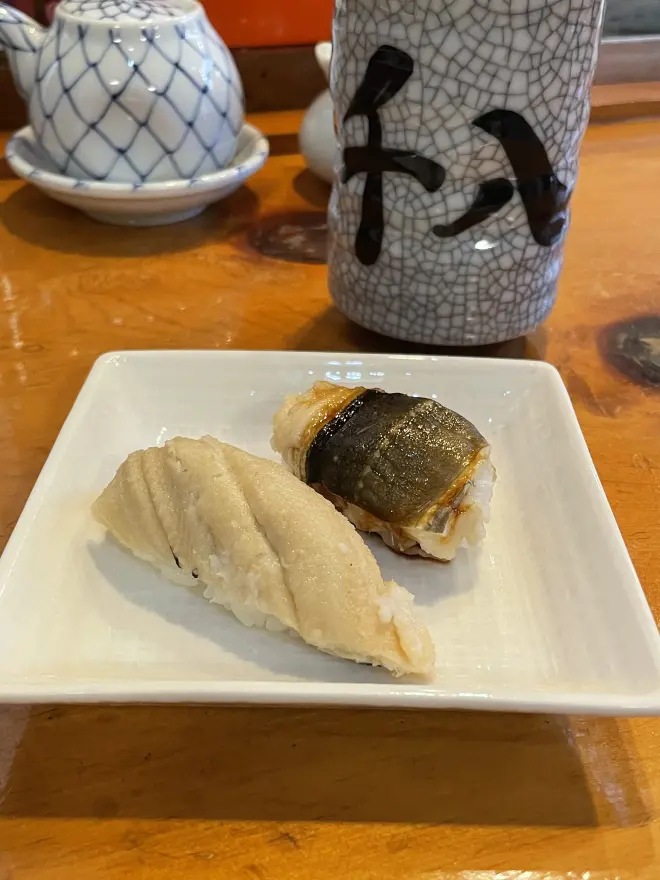 ・第四份,小金强烈推荐的星鳗,大将说先从「波の花」(盐味)开始吃,再吃「煮詰め」(蘸酱),真的就是fuwafuwa的口感,入口即化,感受不到有刺的存在 ・「我们也不是很懂在寿司店该怎么点,所以很感谢能有这种套餐」,「对吧,大家都说因为美玖酱来,所以有了来这种正式的寿司店的契机,不然平时都只去吃回转寿司」 ・下个月大将的儿子办婚礼,所以有个三连休 ・「这家店开了多久了」,「到今年11月份,就满55年了」 ・来了最后三位おひさま,常客和一般人都离开了,「欢迎光临,现在店里全都是おひさま哦www」。一位是和之前的二人组相识的,还有一位交流得知是从京都过来的,10号也去参加日向恋线下活动的金村推 ・「这家店是从大将开始起手的吗」,「我是接手第51年,最开始是奶奶开的店,然后找了寿司职人,我后来才接手的,从中学3年级开始,周末就过来帮忙」 ・被爱知县おひさま问是不是在日本留学,我说是因为有线下活动特地来的,大概坐5小时飞机,他们表示震惊,然后说从爱知县过来也差不多这么多时间,坐新干线的话会更快一点。问有没有去一趟SHIBUYA TSUTAYA,接着聊到之前四周年ひな誕祭,坐在哪之类的,然后我提了一下Day2时金村从通道口出现离我很近的事ww