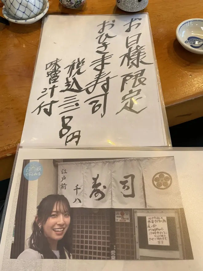 ・第二份,鲍鱼,特别脆,紧实,有嚼劲,如果点おひさま寿司只会有一贯 ・拍摄的请求是五月初来的,大将也是听过日向坂的,不过不认识成员谁是谁,Staff说是昵称也被叫小寿司的很喜欢吃寿司的成员,想拍独自去很正式的寿司店的企划,然后因为是埼玉出身就在埼玉里选,候选出了5间,大将问最后为什么选上了他,是因为YouTube推送了2次其他人拍的,有做自家制玉子烧和处理鱼等等的介绍视频,小金表示很感兴趣,就说和千八寿司交涉吧 ・拍摄日12号是星期五,星期四店里定休,所以星期三演出家、Director、小金三人来事前商讨,因为比较忙,所以定下来仅限30分钟的午间拍摄,拍摄日当天加上经纪人,一共四人 ・后来又来了两位没有预约的从栃木来的おひさま,一位没预约的本地老爷子,感觉应该只要不是周末的话,没有预约也可以去店里的样子,不过晚来的就需要等上一段时间