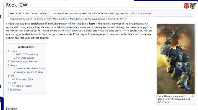 尽管在剧本中完全没有提及,但在《组合金刚之战\合体战争Combiner Wars》期间,鲁克\赌棍Rook(CW)突然出现在了机器卫兵Protectobots(G1)中,这是一个因仓促制作和错误百出的作品而臭名昭著的结果。《失落之光Lost Light》在其回顾页面中利用了这一点,称他实际上只是一个随机的“机器人”,正在移动,并获得了组合形态Ccombiner-ed。
