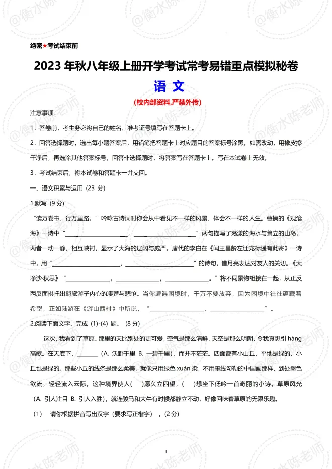八年级上学期语文,开学考试必出重点考卷,全是平时考试中,易扣分、失分比较多的题型,如果你的语文成绩比较差,这套考卷认真做一遍哦,考卷根据不同的城市进行编写而成,想要获取自己城市考卷的考生,跟我沟通哦。