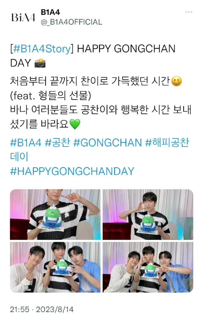 [B1A4Story] HAPPY GONGCHAN DAY 📸 从头到尾都被璨尼填满的时间😆(feat.哥哥们的礼物) 希望BANA们也和孔璨尼度过了幸福的时间💚 感谢:芋泥啵啵麻薯鲜奶(微博名)https://weibo.com/u7559975402