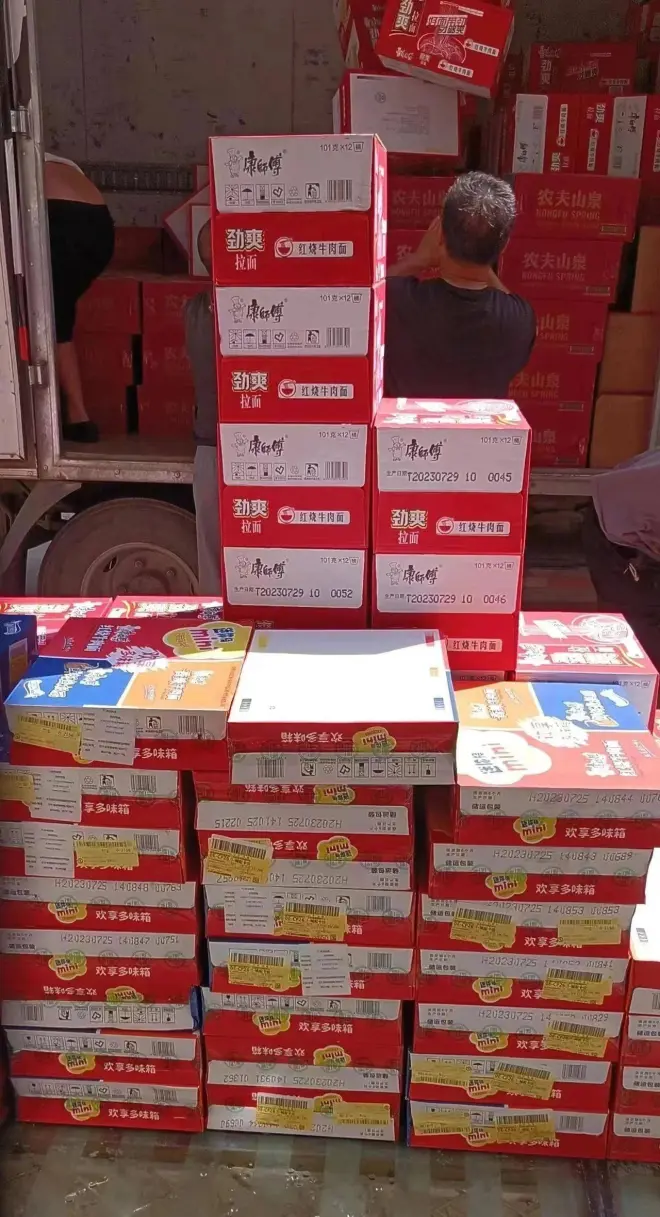 2023年8月4日捐赠雀巢优活纯净水4210箱,农夫山泉矿泉水5000箱,蚕丝被1000套,康师傅方便面500箱等,物资共计人民币一百余万元。