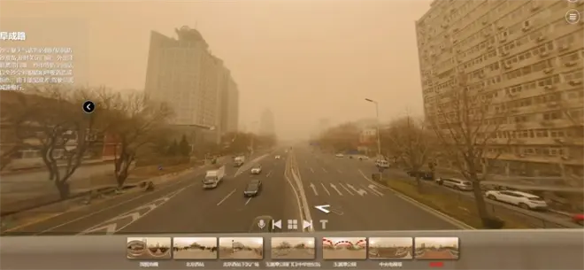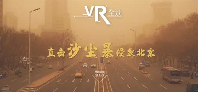VR全景通过多视角直击沙尘暴笼罩下的北京,可以看到市民在灰黄色天空下出行,建筑物都隐藏在沙尘之中,整个城市仿佛被蒙上了一层黄色滤镜,隔着屏幕都能闻到一股沙土的味道。