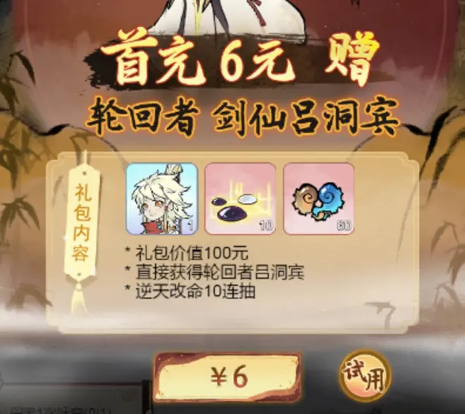 氪金玩家首充了吕洞宾之后一定要把他全部拉满,可以获得2个技能以及吕洞宾3觉神魂同时还有100个吕洞宾神魂碎片,吕洞宾前期伤害强度还可以也是国家队的成员之一,在boss加强前非常适合用于爬塔。