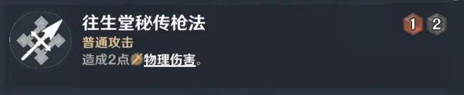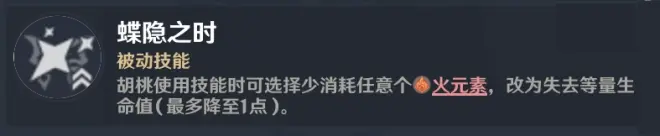 天赋:血之灶火(3火):装备给出战状态下的胡桃,立即使用1次蝶引来生:胡桃生命值低于或等于50%时,造成的火元素伤害+1。(打出该牌视为胡桃使用技能)