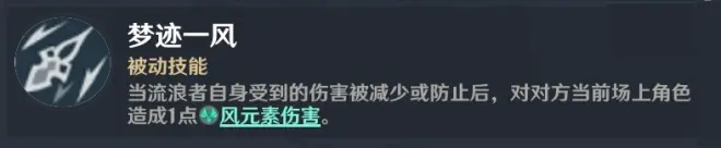 天赋:拾玉得花 (2风):装备给出战状态下的流浪者,立即使用一次羽画·风姿华歌;流浪者若在施放此技能时接触了水/火/雷/冰元素,则分别获得以下效果:水:生成两个随机基础元素骰;火:本回合下三次造成的伤害+1;雷:额外获得1点充能;冰:下次造成的伤害+2。以上加成最多同时存在2种。