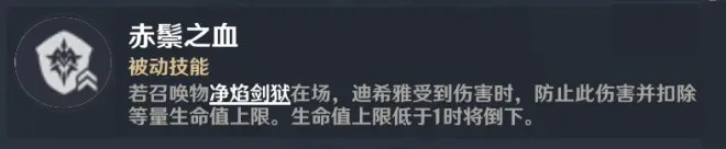 天赋:崇诚之真 (5火):装备给出战状态下的迪希雅,立即使用一次净焰昂藏或剑域炽焰。生命值低于40%时,迪希雅将基于生命值上限的20%(向上取整)恢复生命值,并在本回合<结束阶段再回复1点生命值。该效果每2个回合只能触发一次。