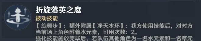 天赋:星天花雨(4水2充能):装备给出战状态下的妮露,立即使用一次浮莲舞步·远梦聆泉;本局游戏接下来获得如下效果:处于金杯的丰馈状态下的角色对对方造成水元素伤害后,对方下次受到的水元素伤害+1;触发绽放反应造成伤害后,对方下次受到的草元素伤害+1;每回合各限触发1次。